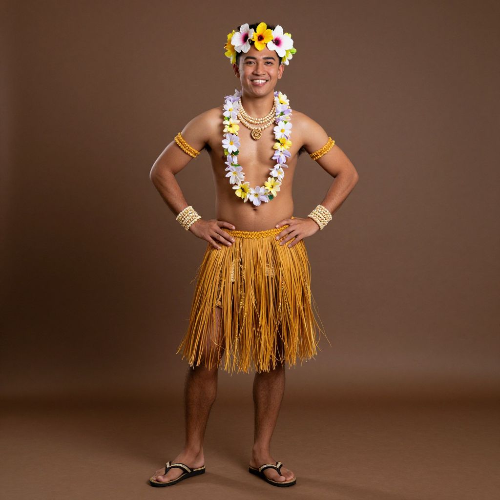 Photograph of a smiling, muscular, tan-skinned man standing against a brown backdrop. He wears a colorful floral crown, a long yellow grass skirt, a white and yellow flower lei around his neck, gold armbands, and matching gold bracelets. His chest is bare, and he has black flip-flops on his feet. The background is plain, and the lighting is even, highlighting his festive Hawaiian-style attire. His hands are confidently placed on his hips, and he exudes a cheerful, relaxed demeanor.