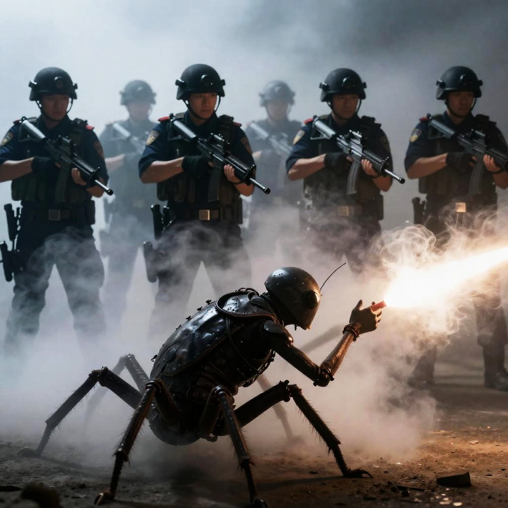 Photograph of a tense scene. Six armed police officers in helmets and uniforms stand in the background, partially obscured by thick white smoke. Foreground shows a shadowy, large, insect-like creature with dark, ured limbs and a red-tipped appendage. Officers aim firearms at the creature. Bright light bursts from the right, illuminating smoke. Intense expressions on officers' faces.