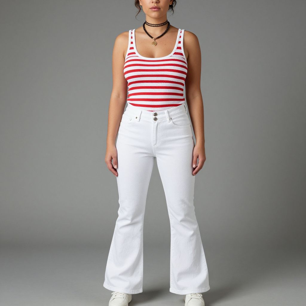 Woman, casual streetwear, ribbed tank top with horizontal red stripes and white background, scoop neck, flared high-waist white jeans with button closure, chunky white sneakers, black choker, beaded necklace with pendant, studio background. Sexy. Pretty face and beаutiful eyes. Big breasts.