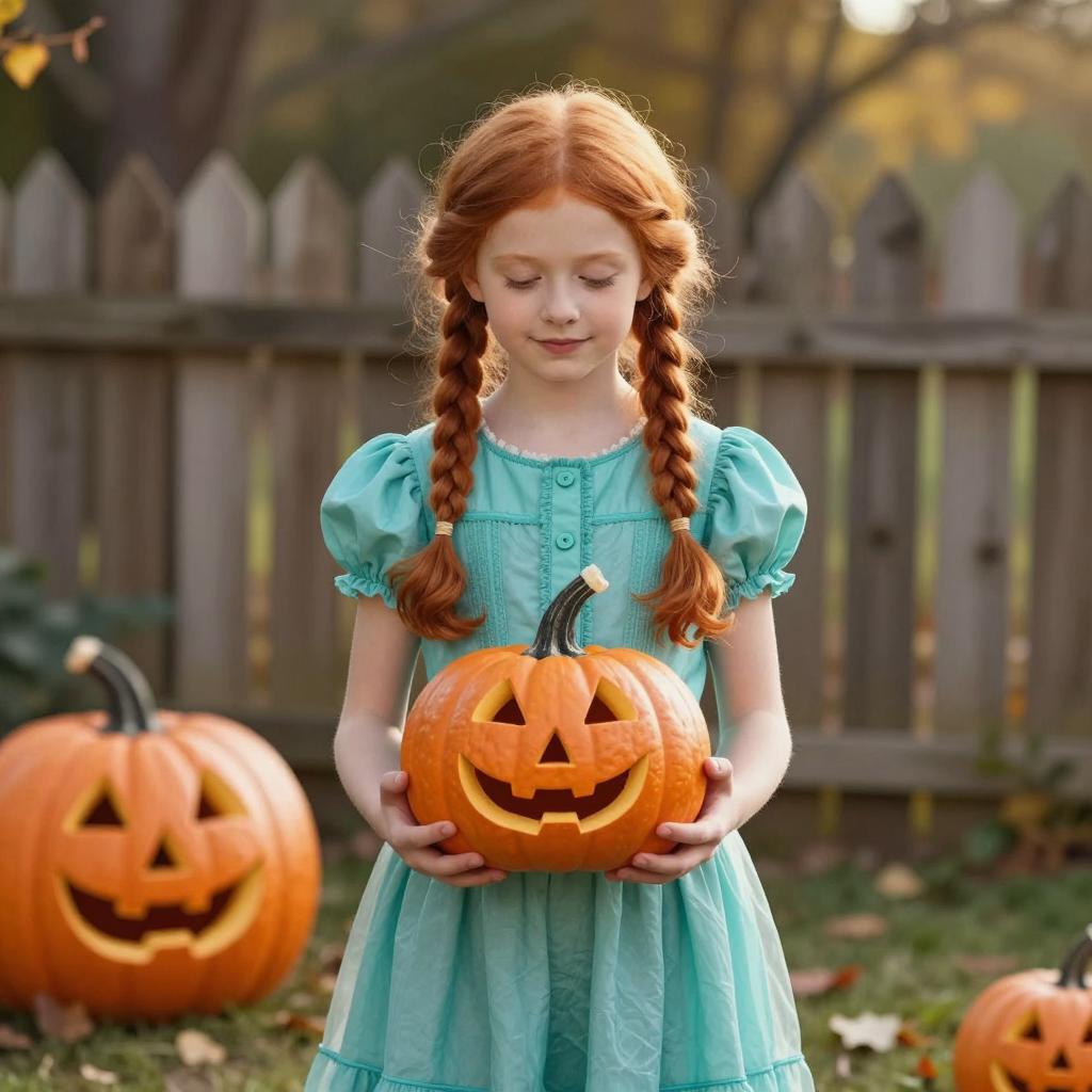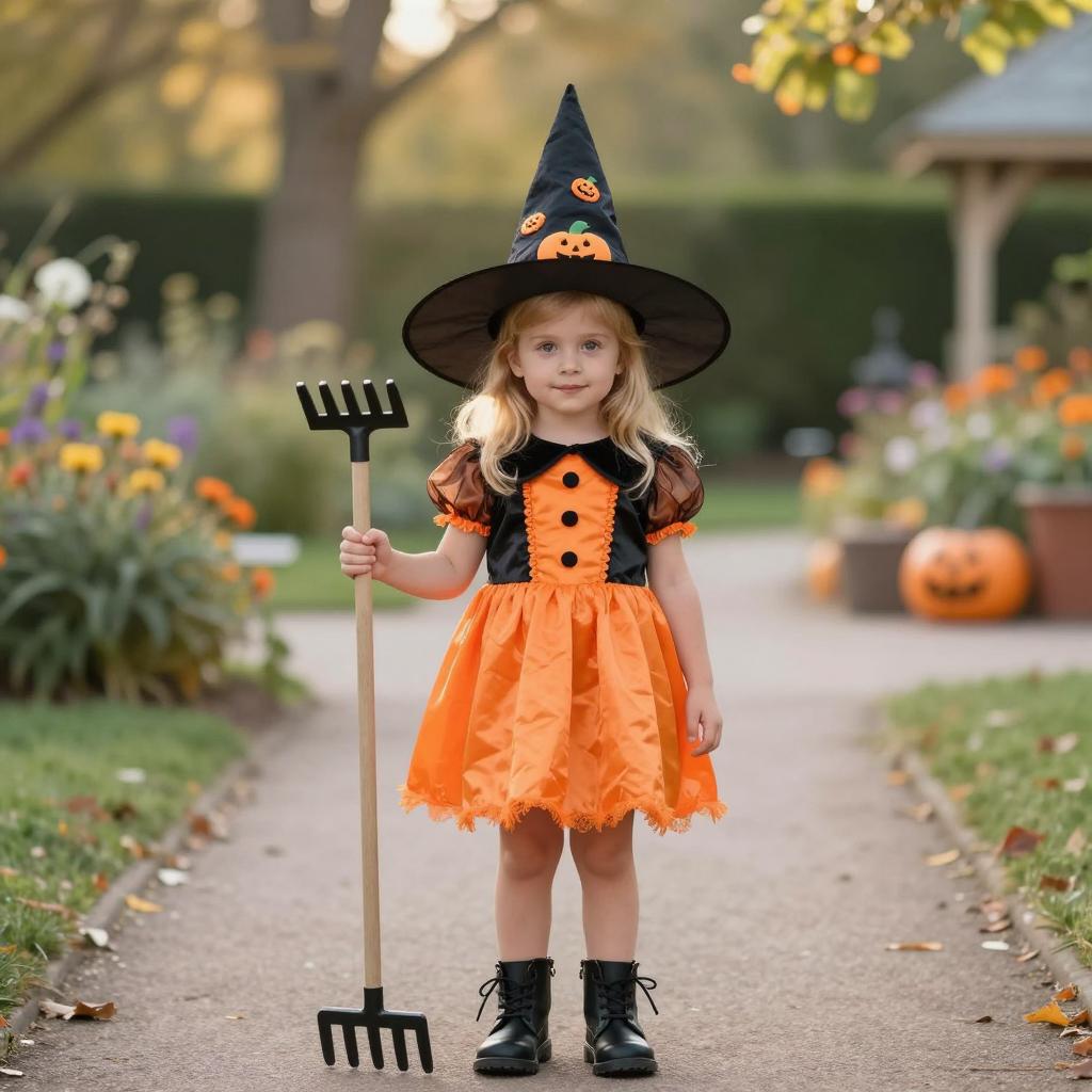 Fruit salad halloween, photograph of a smiling young girl in a colorful, autumn-themed costume, costume made of artificial fruits and leaves, large red flower headpiece with yellow edges, orange tulle skirt, red sneakers, standing in front of a plain grey background, two orange pumpkins in the background, bright natural light, daytime, child model, playful and festive outfit, fall season, whimsical and imaginative costume design