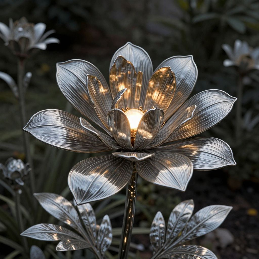 Photograph of a glowing, metallic flower lamp with illuminated petals, set against a dark, blurred garden background. The lamp's intricate, silver leaves reflect