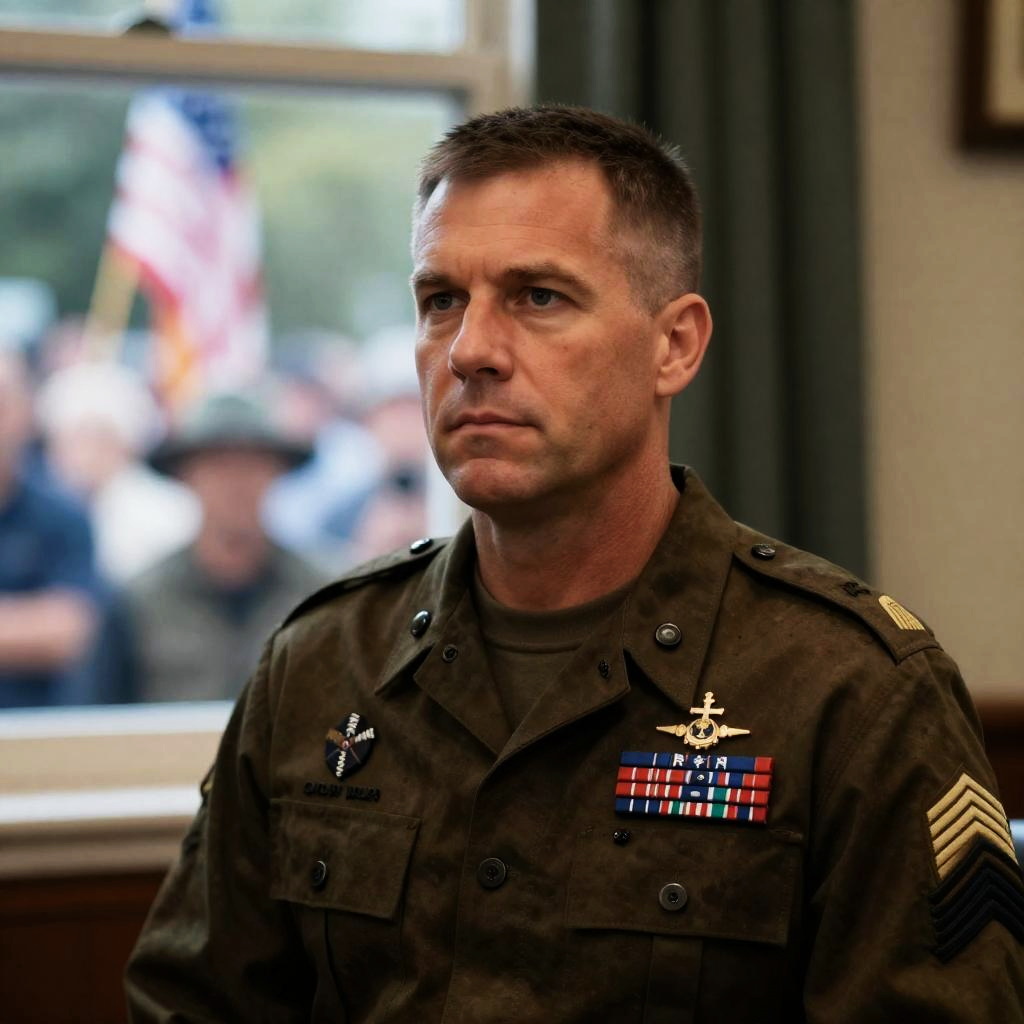 Middle-aged man with short brown hair in military uniform with medals, seated indoors, green curtains, window in background, serious expression. Outside window, blurred crowd with American flag, man in hat. Dim lighting.