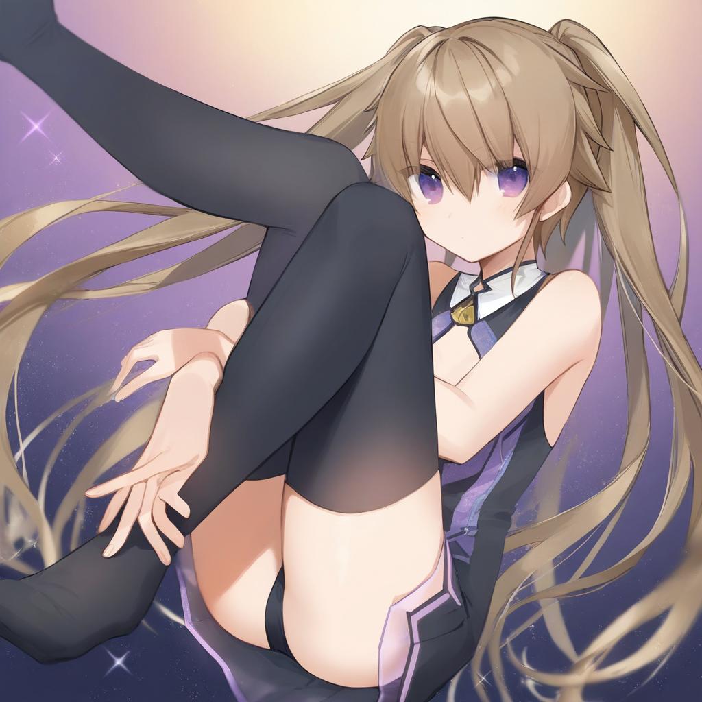 Arisaka mashiro, ao no kanata no four rhythm, 1girl, purple eyes, pink eyes, hair between eyes, brown hair, very long hair, long hair, twintails, small breasts, ass, thighs, black thighhighs, by artist miyase mahiro, leet