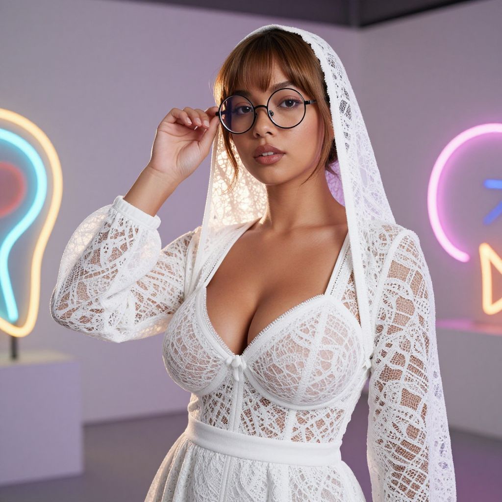 A modern white lace costume styled by a graceful woman with light brown skin, round glasses, and a thoughtful expression, photographed in a neon-lit art gallery with abstract sculptures and soft backlighting that enhances the delicate lace fabric. The woman has big breasts and cute face