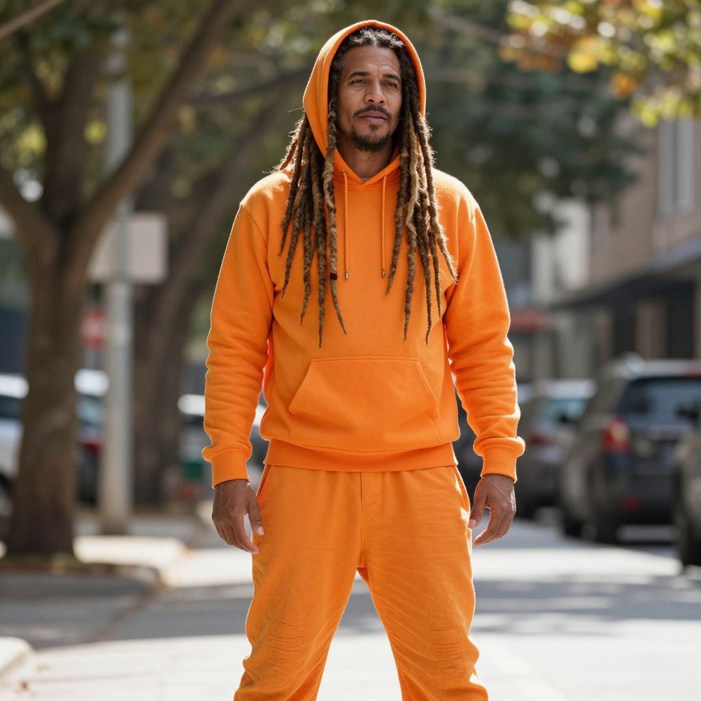 A tall, rugged man with deep, flowing dreadlocks, wearing a vibrant orange hoodie with a hood pulled up, paired with bright orange pants that extend to his knees. He stands confidently in a urban street setting, sunlight filtering through the trees behind him, giving the image a warm, dynamic atmosphere. The man has a relaxed, expressive face with a hint of wisdom and charisma, adding depth to his presence.