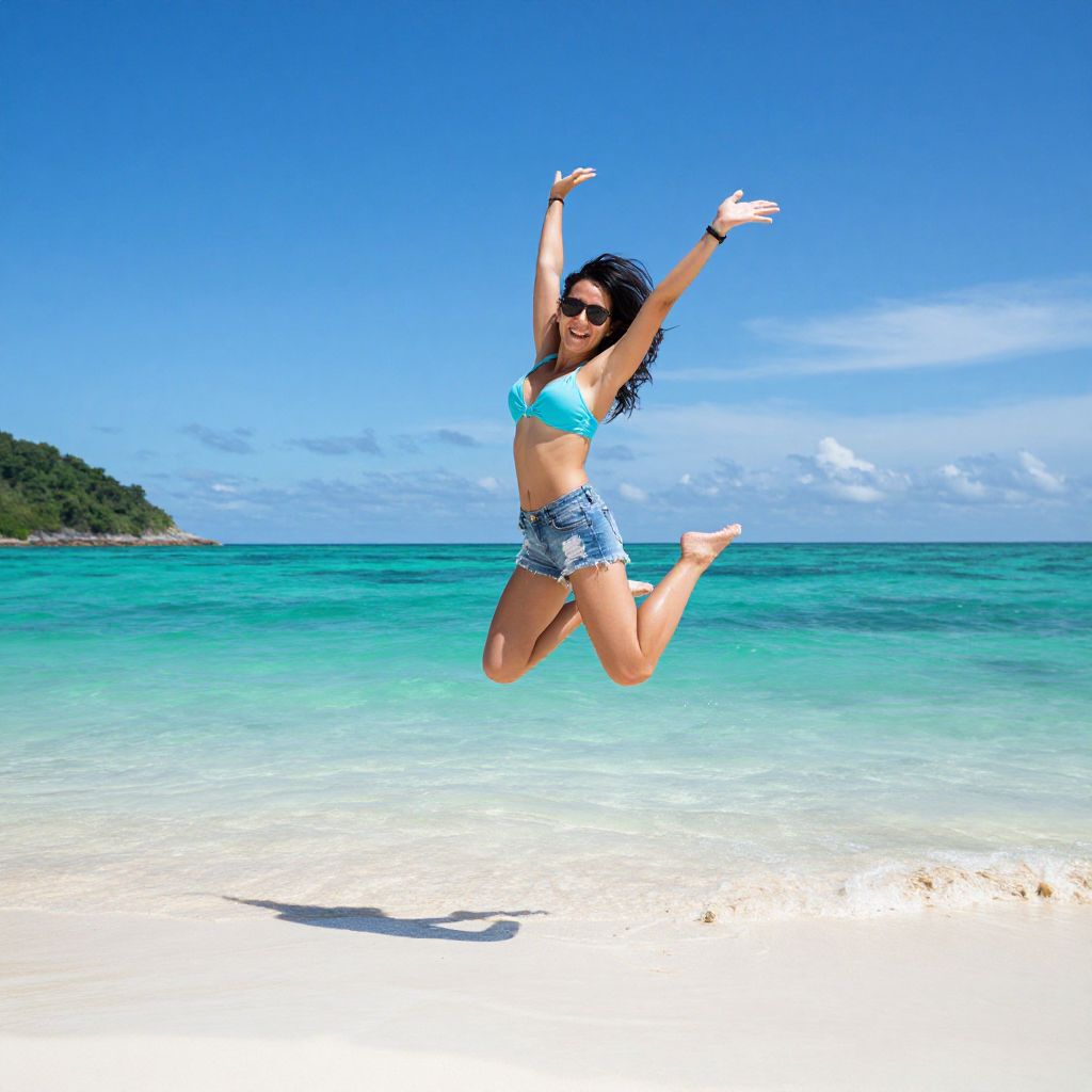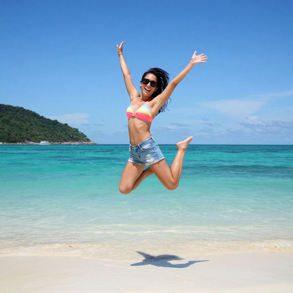 Woman leaping joyfully against the vibrant backdrop of turquoise waters and clear skies in the Perhentian Islands, Malaysia, showcasing the idyllic beauty of this renowned destination.
