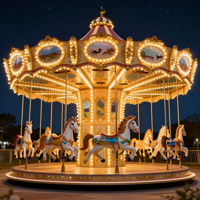 Glowing, ornate carousel at night with illuminated golden lights, white and brown horses, and circular mirrors against a dark blue sky.