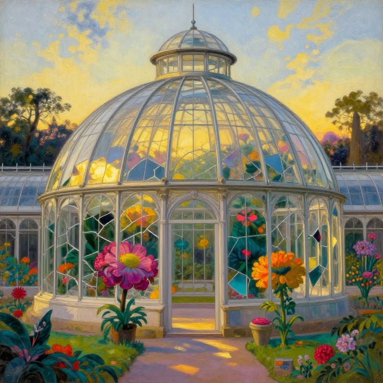 Score_9, score_8_up, score_7_up, score_6_up, score_5_up, Lush, realistic oil painting of a secret garden growing inside a greenhouse, with vibrant and colorful flowers, vines, and foliage covering the walls and ceiling, with warm sunlight streaming through the glass panes, creating a cozy and inviting atmosphere, a small wooden bench in the center, a glass tea set on a small table, a cat lounging on the bench, a gentle breeze blowing through the garden, creating a peaceful and serene environment., Nintendo design, gray, red, (Masterpiece:1.3) (best quality:1.2) (high quality:1.1)