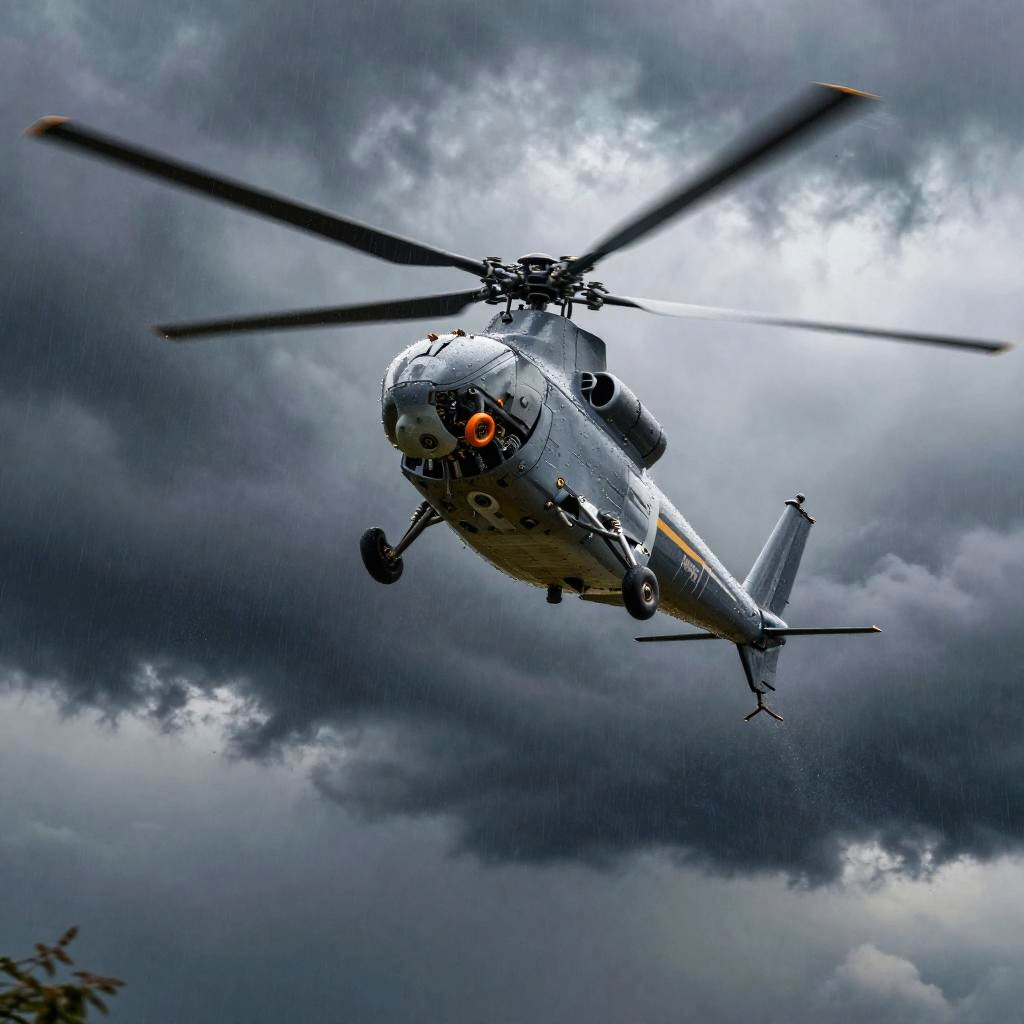 Helic performing mid-air stunt in stormy weather, rain droplets on rotor blades, intense action shot, blurred motion effect, moody dark clouds swirling, hyper-detailed mechanical parts, photo-realistic style
