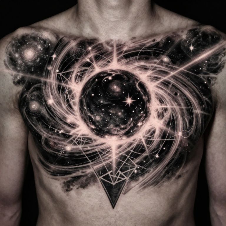 Black hole chest tattoo in surreal style, a deep dark orb in the center of the chest surrounded by spiraling cosmic dust and radiant light beams, intricate geometric shapes interwoven with stars and galaxies, dynamic contrast between darkness and glowing elements.