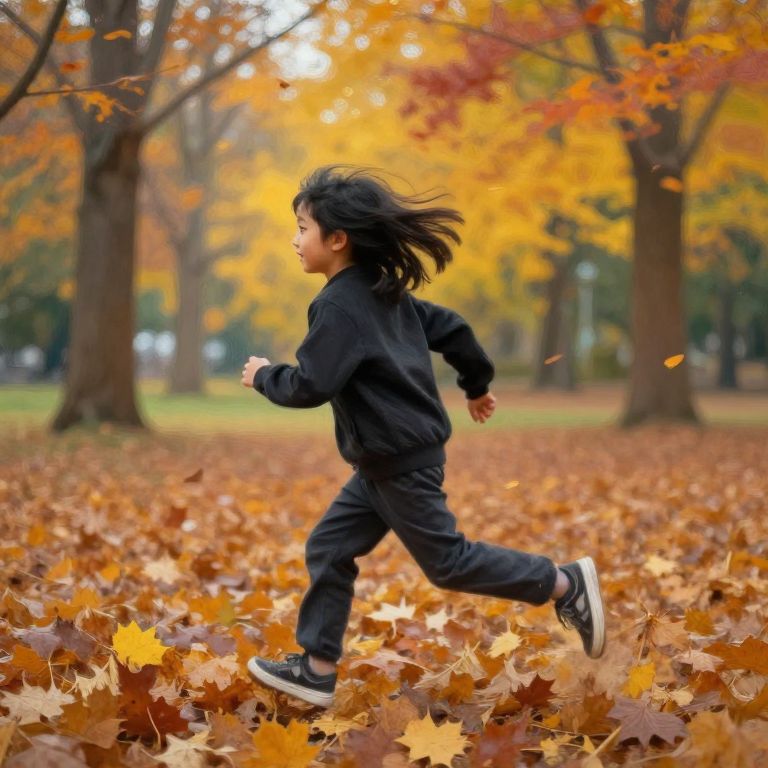 Lucid a rush of colorful leaves swirling around a little girl with her arms outstretched and back turned, hair blowing in the wind, autumn colors, photorealistic,