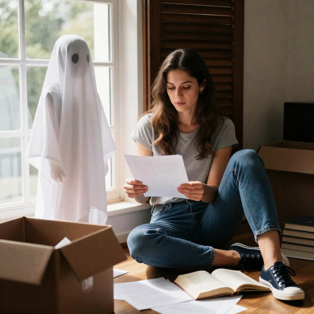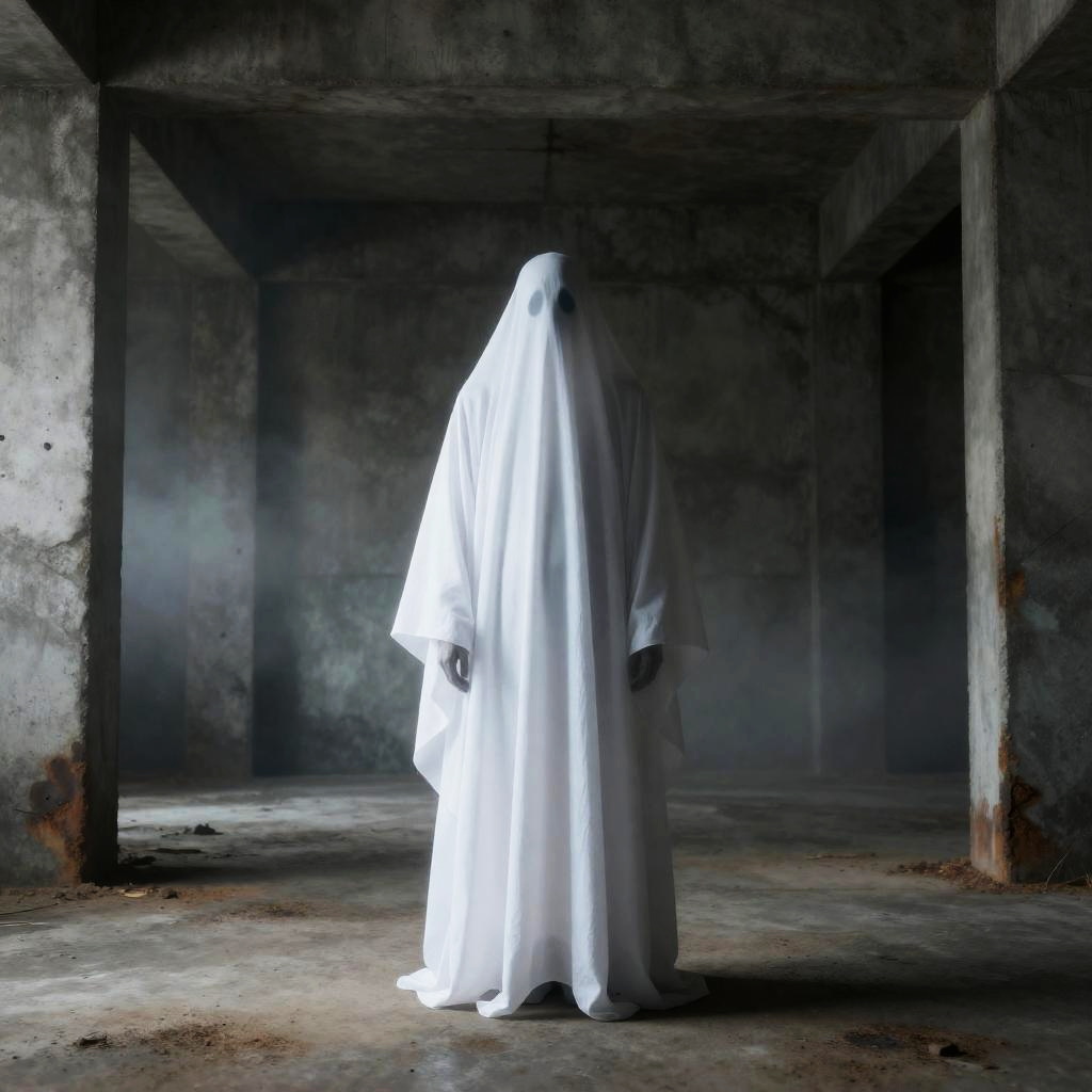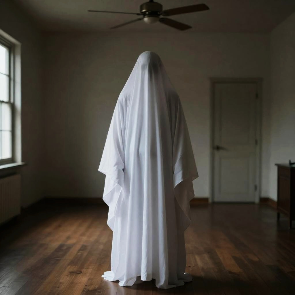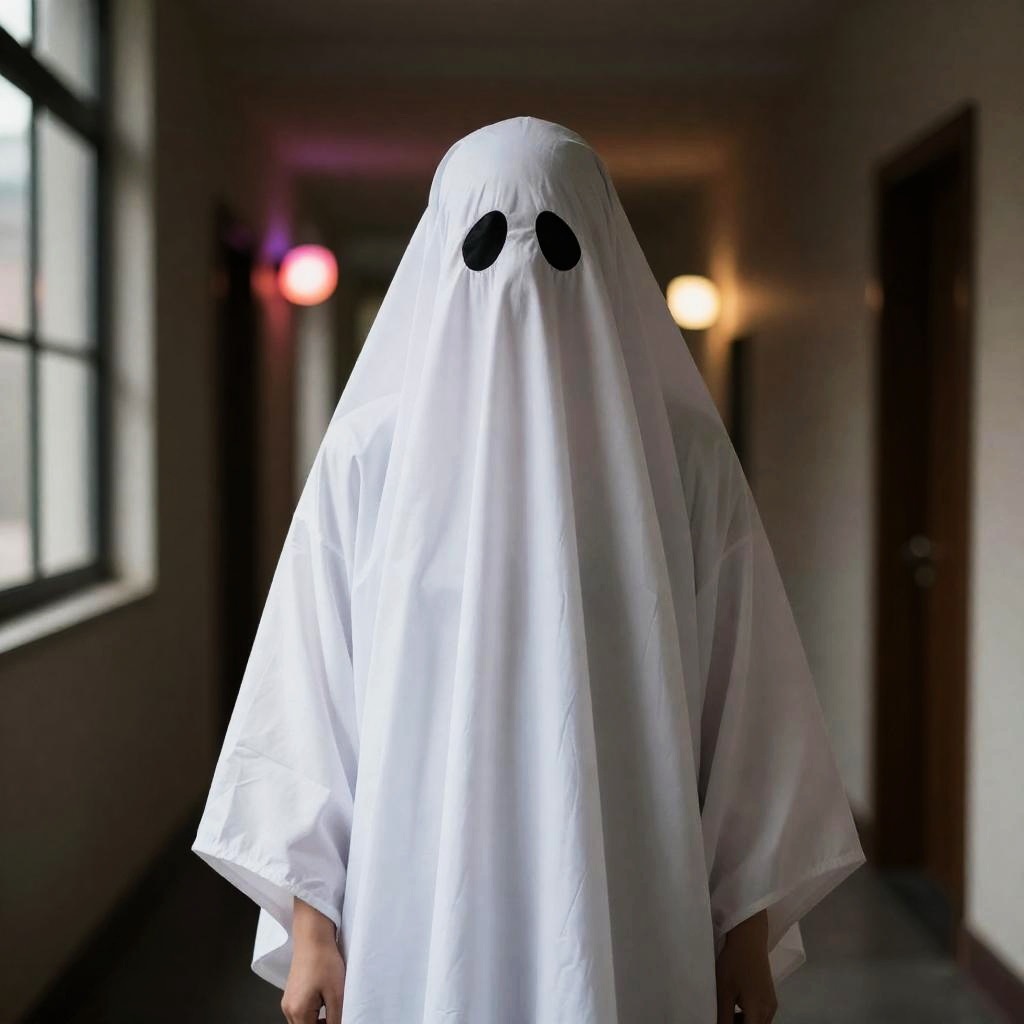 Photograph of a person in a white sheet ghost costume standing in a dimly lit hallway. The costume completely covers their body and head, leaving only a single black eye visible. Background includes blurry, colorful lights and a window on the left. Person's expression is not visible.
