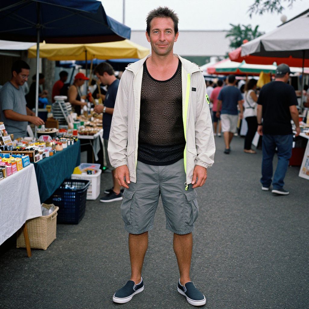 A man, slate gray utility shorts, black mesh tank top, lightweight anorak, neon accents, slip-on sneakers, open-air market vibe, colorful stalls, lively atmosphere, lomography analog photo, relaxed smile, casual confidence. Man has masculine face and piercing eyes