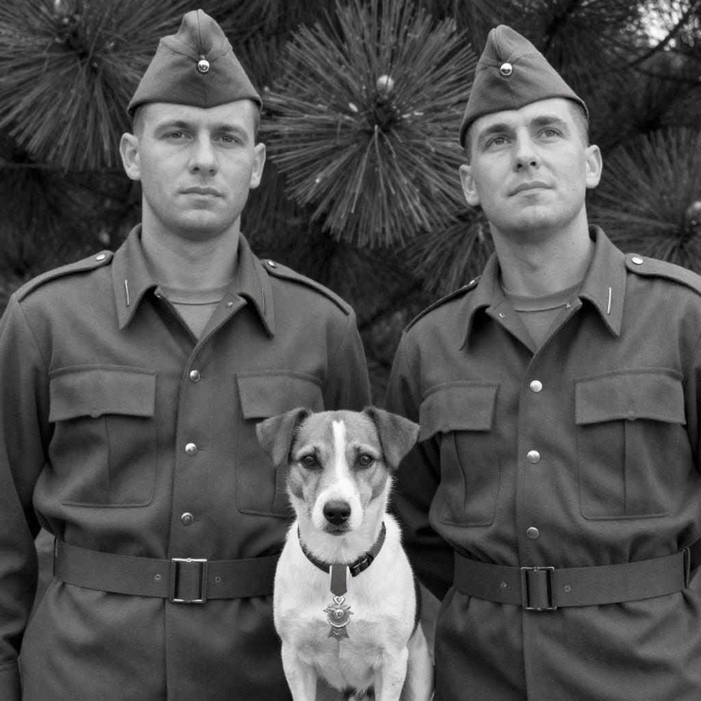 Black and white photograph of two soldiers in uniform with military caps, standing outdoors. One soldier on the left has a neutral expression, the other on the right looks upward. A small dog with a white and brown coat stands between them, wearing a collar with a medal. Pine tree branches in the background. Both soldiers have short hair and wear buttons on their jackets. The dog looks directly at the camera.