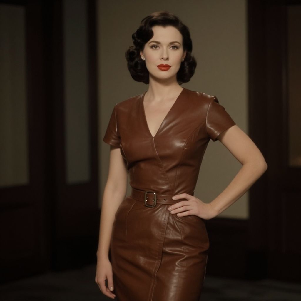 Photograph of a fair-skinned woman with dark, wavy 1940s-style hair, wearing a fitted, brown leather dress with short sleeves