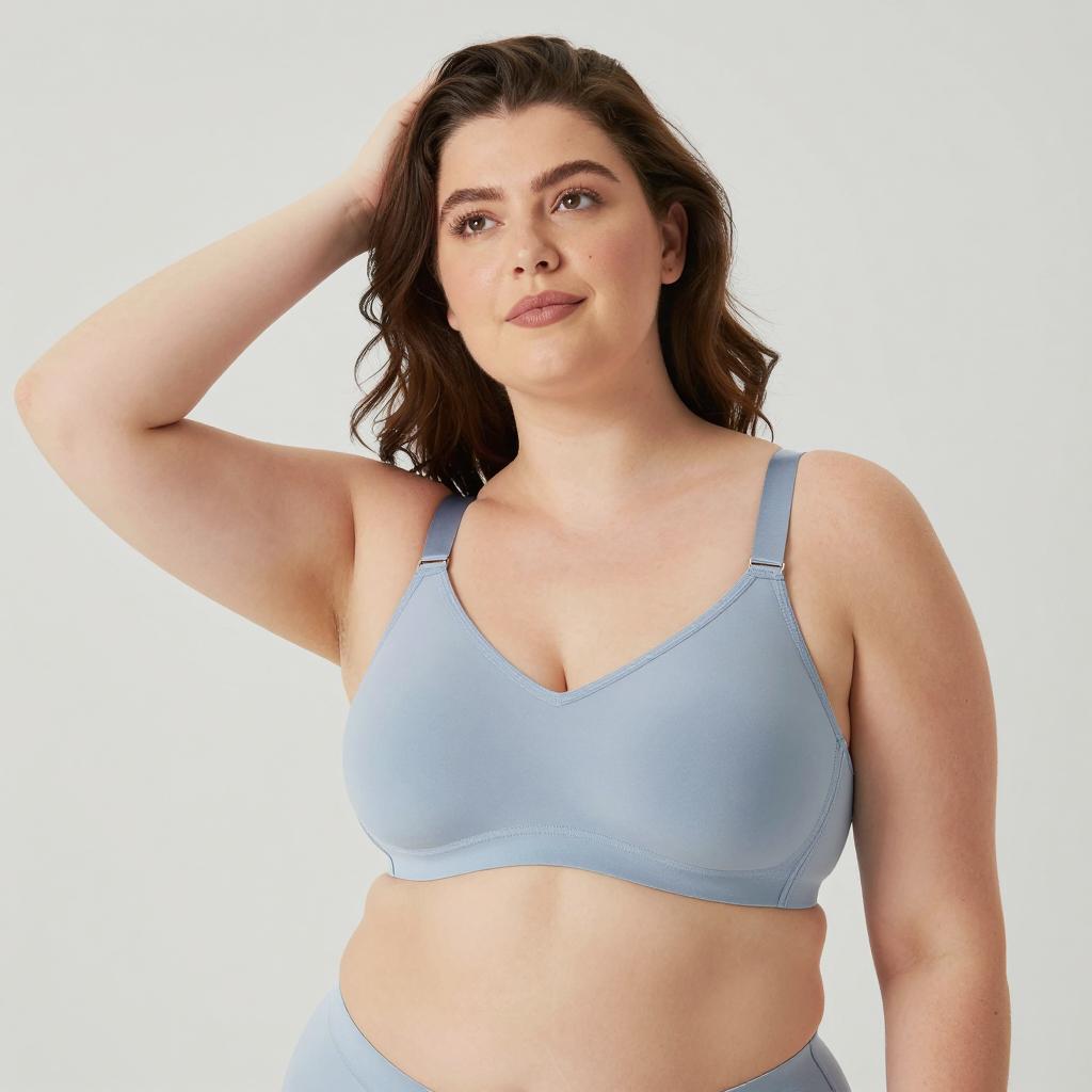 Plus-sized woman with light skin and dark brown hair wearing a light blue, underwired bra. She has her right hand touching her head, looking slightly upwards with a subtle smile. Plain light gray background. Close-up, waist-up view.