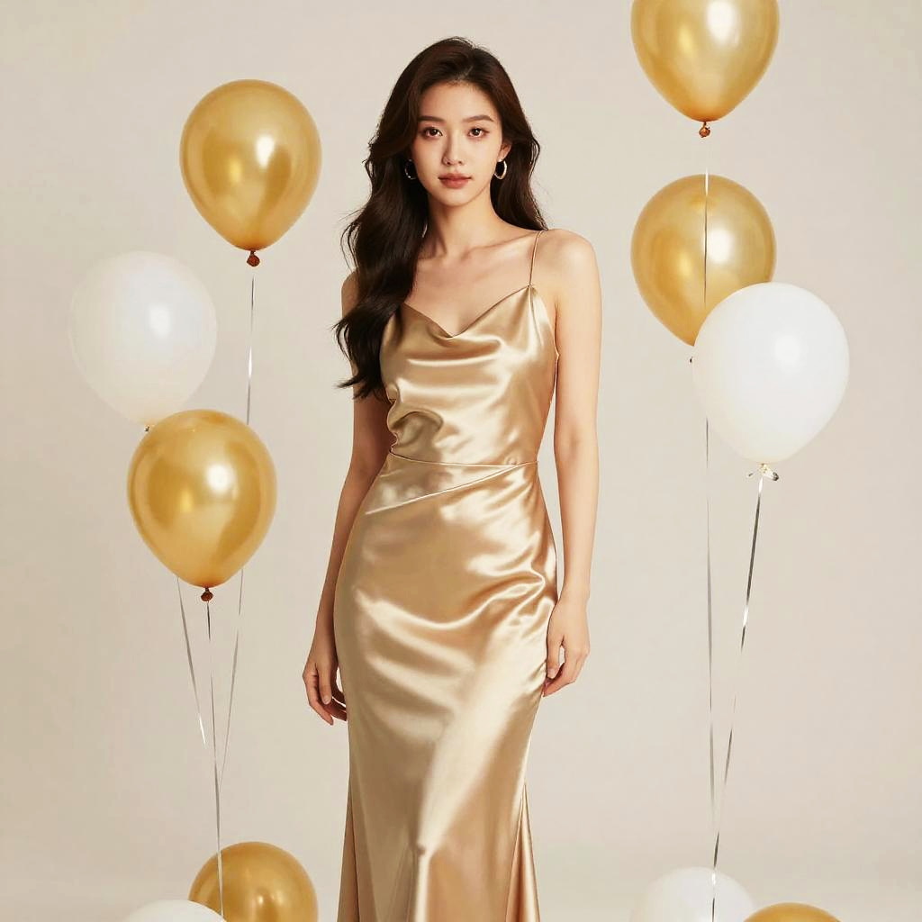 Satin Birthday Dress Woman, woman in a gold dress standing in front of balloons