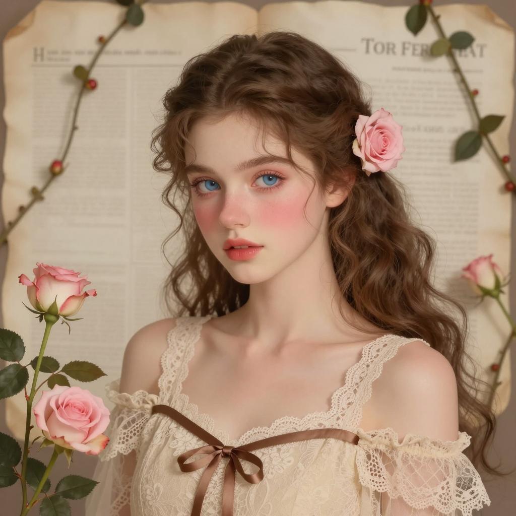 Young woman with pale skin and green eyes, wearing a pink, ruffled off-shoulder dress, surrounded by blooming pink and peach roses. Her dark brown hair is loosely tied up with tendrils framing her face. Intense, direct gaze. Soft, natural lighting. Digital illustration style. Roses in foreground and background. Woman centered, roses encircle.