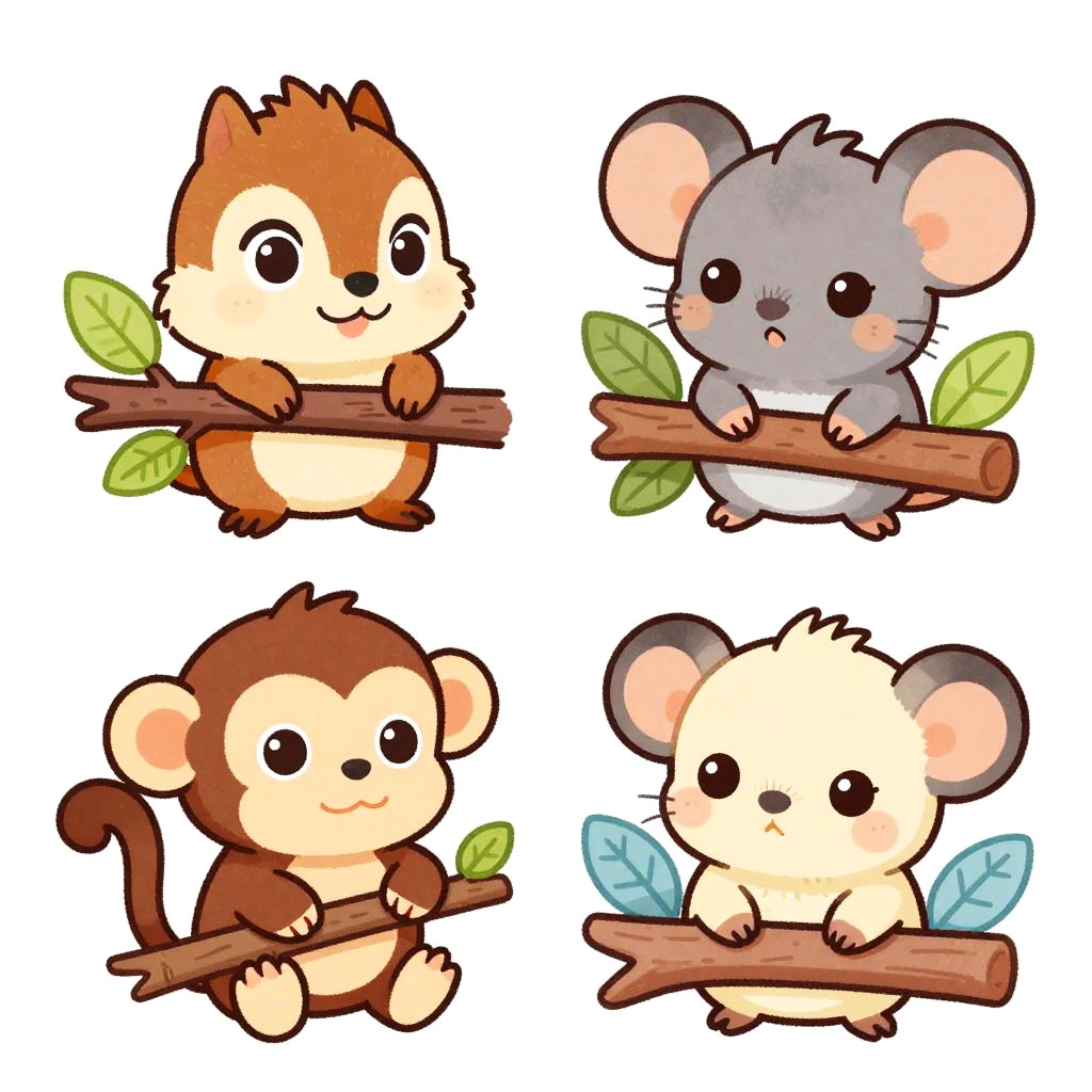 Cute digital illustration of four chibi-style animals: brown squirrel, gray mouse, brown monkey, and cream mouse, each holding a branch with green