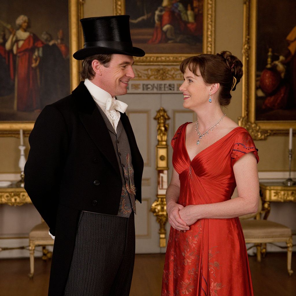 Elegantly dressed characters from *Downton Abbey* share a tender moment in a richly decorated room, with a man in a top hat and waistcoat holding hands with a woman in a vibrant red gown, both smiling warmly against a backdrop of ornate paintings and warm lighting.