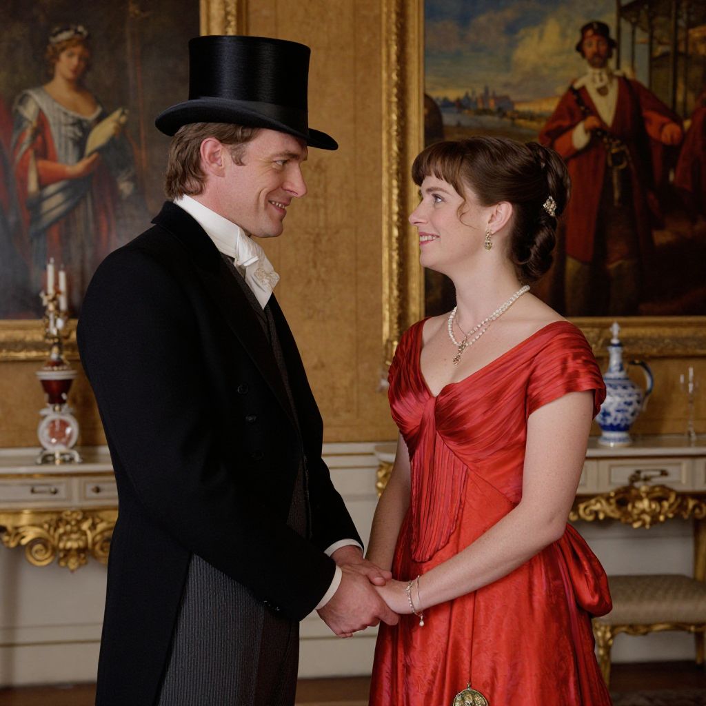 Photograph of a Victorian-era scene featuring a man and woman in formal attire. The man, with fair skin and brown hair, wears a black top hat, black tailcoat, white shirt, and striped trousers, smiling at the woman. The woman, with fair skin and dark brown hair in an updo, wears a red, off-the-shoulder dress with floral embroidery, pearl necklace, and earrings, also smiling. They hold hands, standing in an ornately decorated room with gold-framed portraits on the walls, a carved wooden door, and a blue and white porcelain vase on a console table. The setting exudes elegance and historical charm.