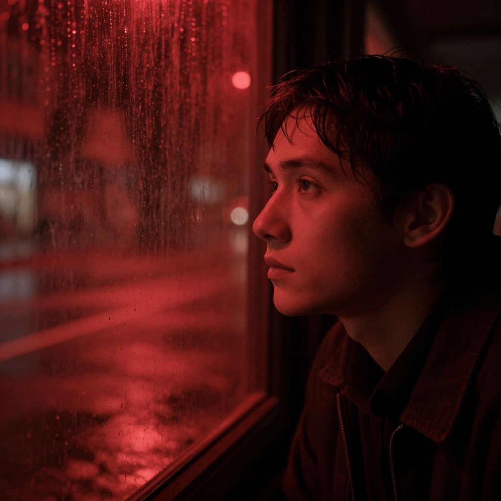 Photograph of a young man with wet, dark hair gazing out a rain-streaked window. The scene is bathed in red light, casting a moody, almost noir-like atmosphere. The man, with fair skin and a contemplative expression, wears a dark jacket. Outside, blurred red lights and wet pavement are visible, adding to the somber, reflective mood. The red light creates a contrast with his pale skin, highlighting his profile. The texture of the rain on the window adds a sense of depth and realism to the image.