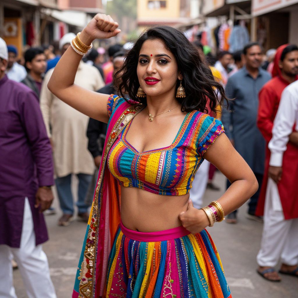 A lively street photography scene of a confident woman with tanned skin and thick black hair wearing a bold, colorful chaniya choli blouse as a costume for a cultural festival, dancing in a crowded market in Jaipur with people in traditional attire around her.. The woman has big tits and cute face
