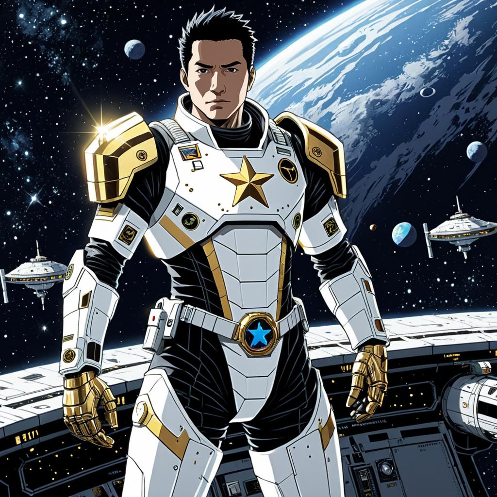 Illustration of a valiant space marshal wearing a white armored suit with gold trim and star emblems. The character has a shining metallic arm and a determined gaze, standing on an orbiting space station platform. The background showcases distant galaxies and planets, depicted in a bold and fantastical anime style reminiscent of Eiichiro Oda's work.