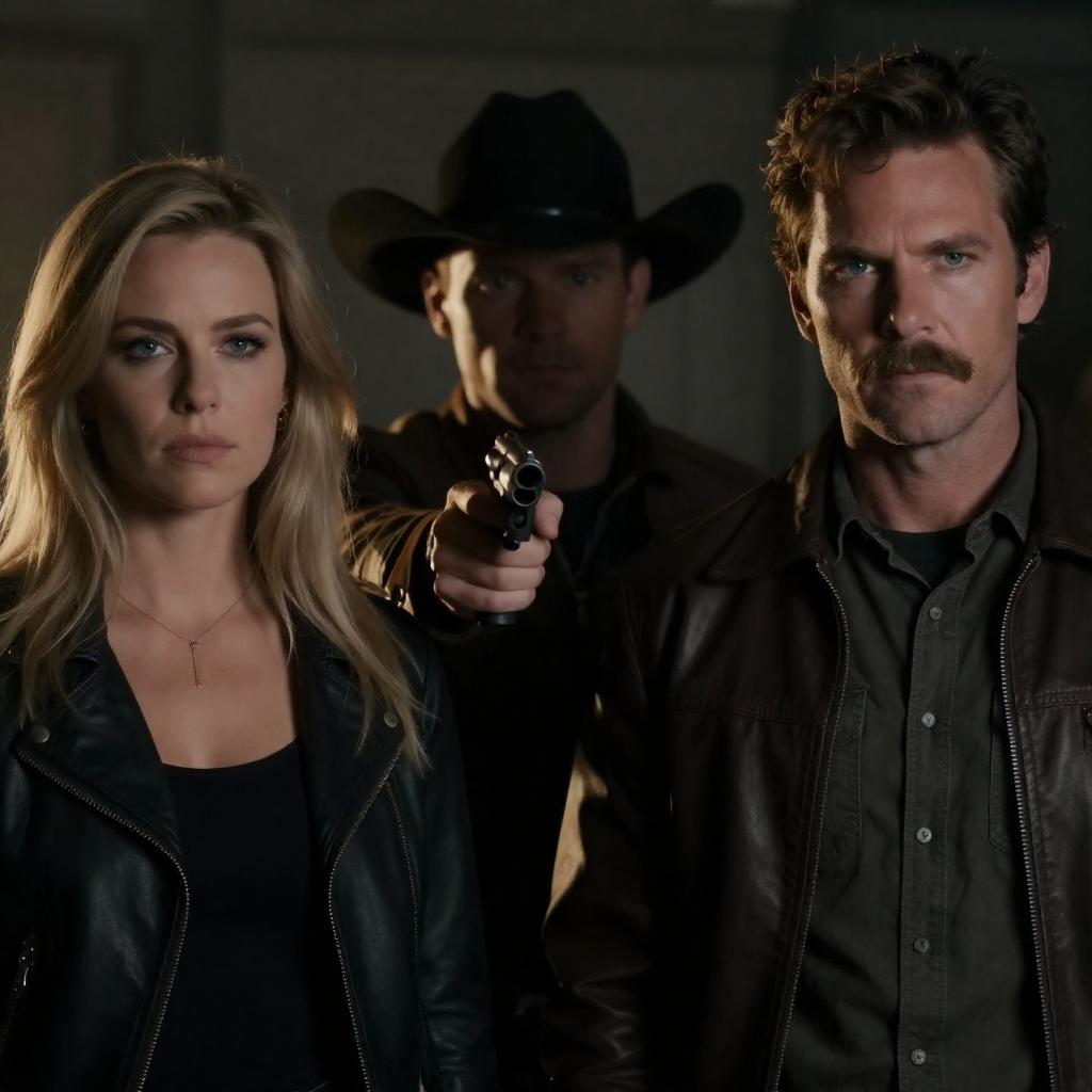Three people standing outdoors by a lake. The man in the center has tousled brown hair, wears a purple shirt, and looks serious. The man on the left has short dark hair, wears a gray tank top, and looks slightly concerned. The woman on the right has blonde hair, blood on her face and arms, wears a white patterned shirt, and touches her head. Background shows green trees and lake. All three have muscular builds. Intense expressions on all faces.