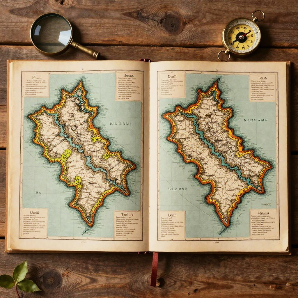 Comparing two ancient maps side by side on a rustic wooden table, detailed textures and vibrant colors highlighting differences, with a vintage compass and magnifying glass nearby, soft natural light casting gentle shadows, high resolution illustration.
