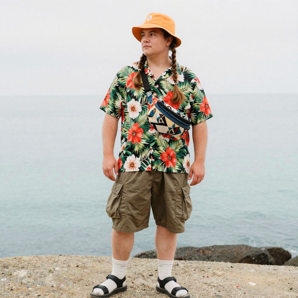 Photo. Stocky Build man, Viking Braid, tacky tourist outfit, Hawaiian shirt with orange hibiscus print, rayon; Cargo shorts with tan, loose fit; Bucket hat with sky blue, cotton; Socks with sandals; Fanny pack with floral patterns, canvas, classic 1970s photo, warm sepia tones, film grain effect