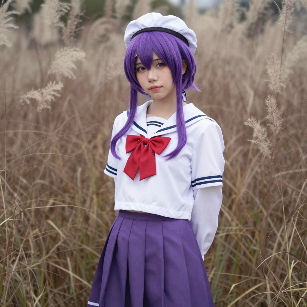 A woman cosplaying as Azur Lane's character Ajax stands in a field of tall brown grasses, dressed in a detailed sailor-inspired outfit with a white beret, a red bow, and a purple skirt. The photo captures her vibrant purple hair and expressive eyes, emphasizing a blend of anime-inspired aesthetics and realistic photography.
