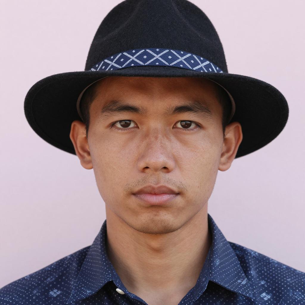 A man with light skin, short dark hair, wearing a black wide-brimmed hat with a blue and white patterned band, and a dark blue patterned shirt. He has a neutral expression, slight shadow on his right cheek, and a pinkish-purple background. His eyes are brown, and he has a small, light stubble on his face.