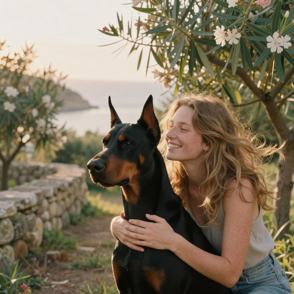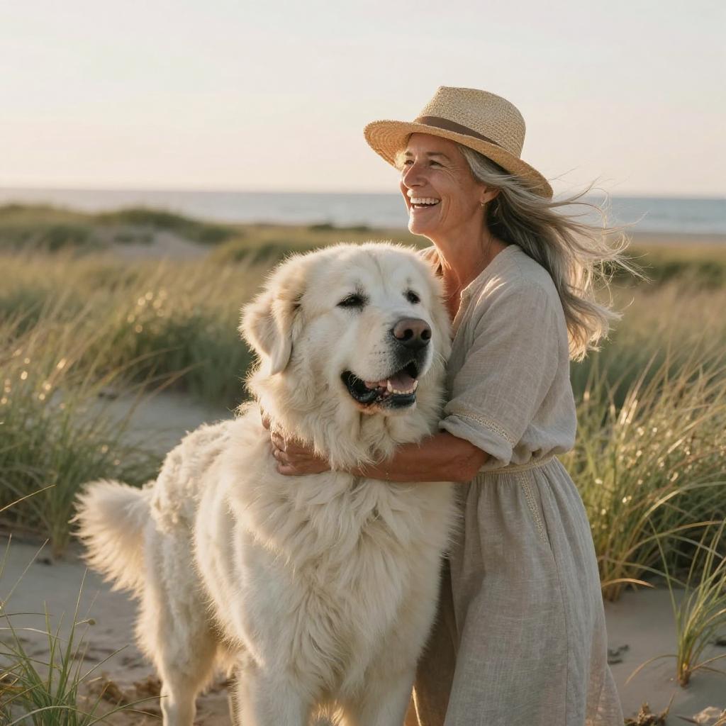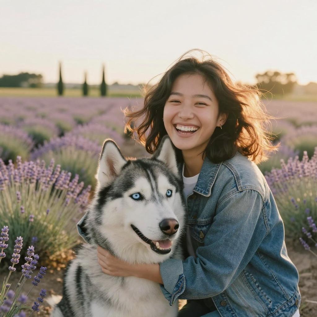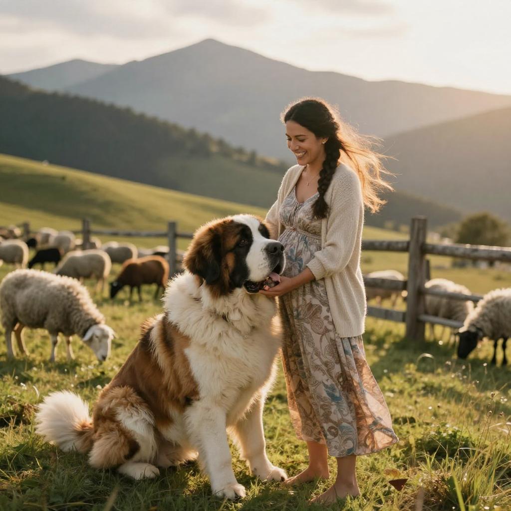 Young pregnant Latina woman with long wavy dark hair, wearing a flowing pastel maternity dress and light cardigan, tender joyful smile as she embraces a gentle brindle English Mastiff (very large, short coat) in a sun-drenched lavender field with a rustic stone cottage and bees hovering, at golden hour, candid and joyful atmosphere, warm natural lighting, golden hour backlight, gentle rim light, shallow depth of field, soft creamy bokeh, vibrant greens softly blurred, tactile fur detail, wind-swept hair, subtle film grain, balanced composition, inviting warmth, authentic lifestyle feel, crisp yet natural color palette