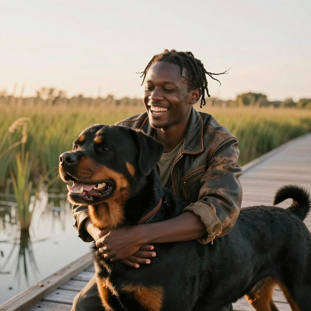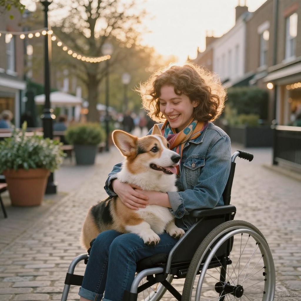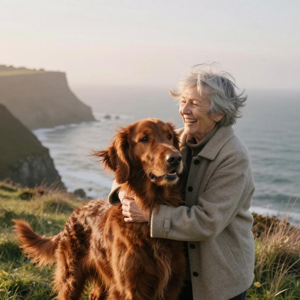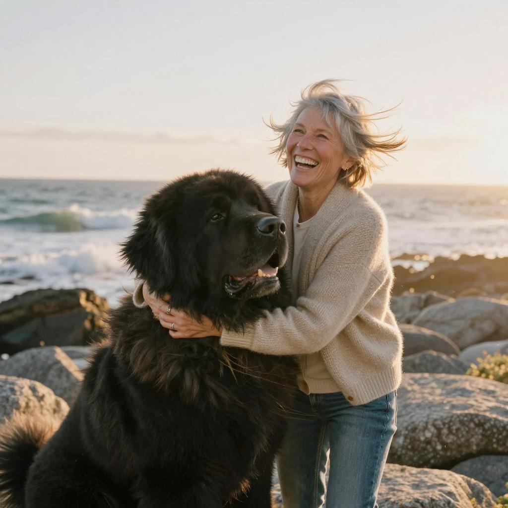 Young pregnant Latina woman with long wavy dark hair, wearing a flowing pastel maternity dress and light cardigan, tender joyful smile as she embraces a gentle brindle English Mastiff (very large, short coat) in a sun-drenched lavender field with a rustic stone cottage and bees hovering, at golden hour, candid and joyful atmosphere, warm natural lighting, golden hour backlight, gentle rim light, shallow depth of field, soft creamy bokeh, vibrant greens softly blurred, tactile fur detail, wind-swept hair, subtle film grain, balanced composition, inviting warmth, authentic lifestyle feel, crisp yet natural color palette