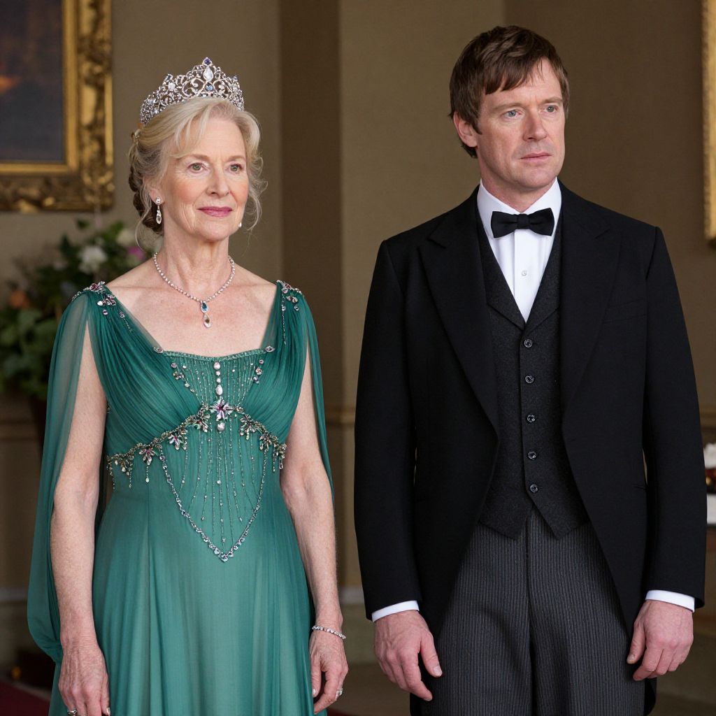 Elegantly dressed characters from *Downton Abbey* stand side by side in a formal setting, with the woman wearing a green gown adorned with sparkling embellishments and a tiara, while the man dons a classic black suit with a bow tie and vest.