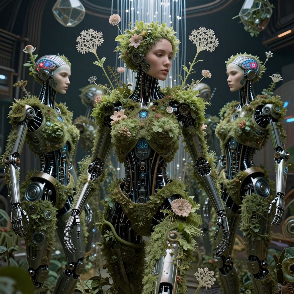 The image depicts a complex, intricately detailed scene of biomechanical woman robots intertwined with botanical elements, creating a surreal, hyperrealistic fusion of organic and synthetic life. The central figure is a group of humanoid robots, their metallic forms adorned with lush, verdant foliage and delicate, fractal flowers. The robots' mechanical components, such as their electronic brains and neural networks, are exposed, blending seamlessly with the natural world. The scene is set against a dark, industrial backdrop, with fiber optics and geodesic structures adding to the futuristic, cyberpunk aesthetic. The overall composition is dynamic, with the robots and botanical elements interacting in a way that blurs the lines between the organic and the mechanical, evoking a sense of transcendent, biopunk beauty.