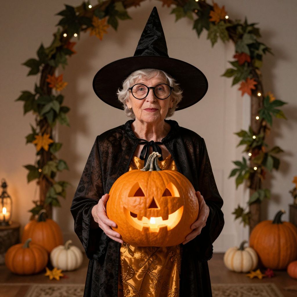 Elderly woman dressed in a festive witch costume, complete with a black hat and glasses, stands warmly illuminated by indoor lighting while holding a glowing jack-o'-lantern carved with a mischievous smile, surrounded by autumnal decorations including pumpkins and greenery.