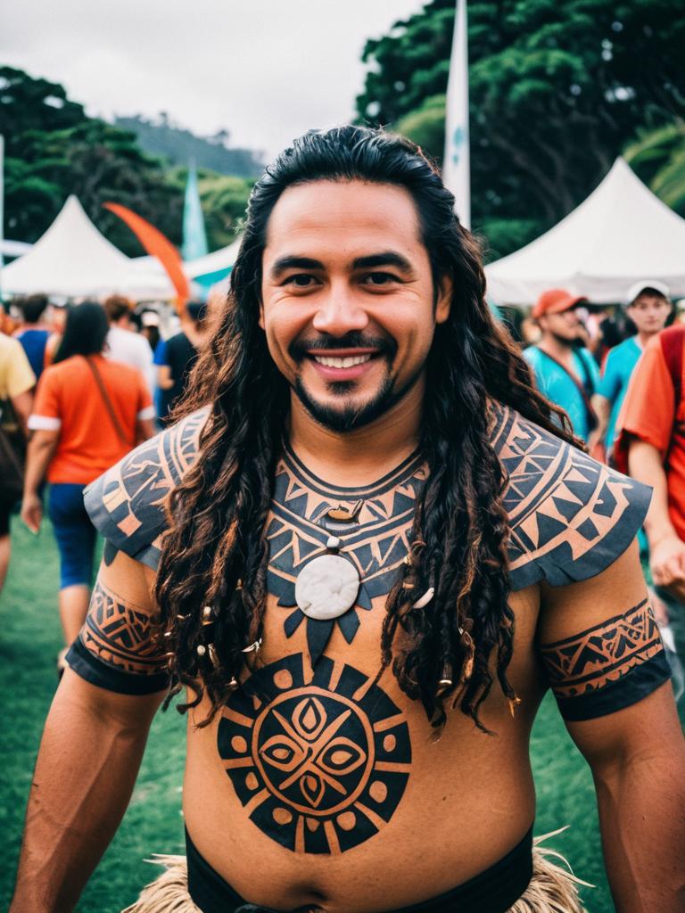 Portrait of a man wearing a Moana-inspired costume with tribal patterns and a shell necklace, smiling at an outdoor festival. The background includes festival tents and other attendees, set in a lush green area with palm trees under a cloudy sky.
