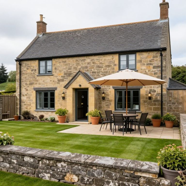 Stone-built cottage with a slate roof and large windows overlooks a neatly manicured lawn, featuring a patio area with a square table, six chairs, and a beige umbrella providing shade, surrounded by potted plants and bordered by low stone walls.
