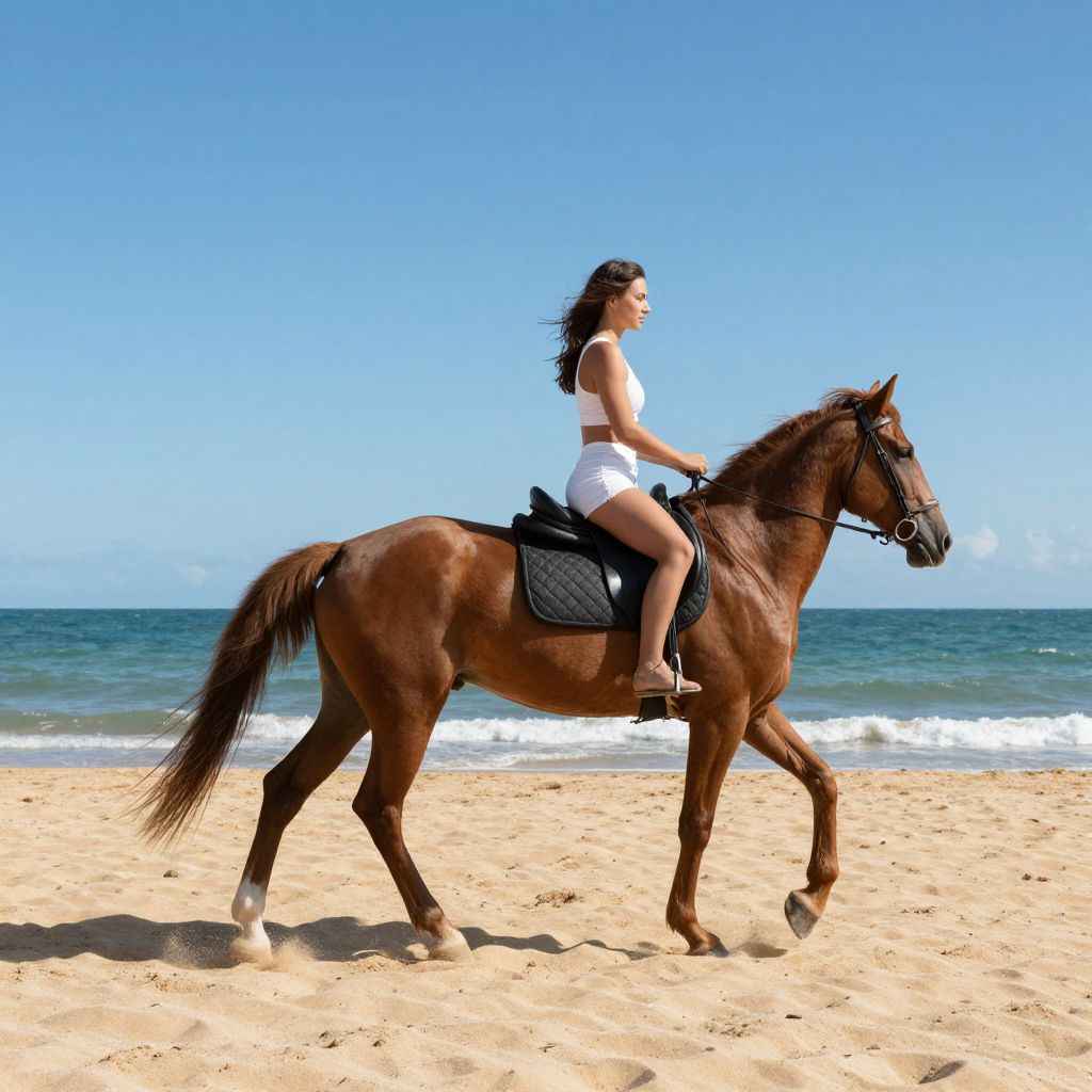 Photograph of a young woman with long, dark brown hair riding a chestnut horse on a sandy beach. She wears a white, sleeveless, one-piece swimsuit and black riding boots. The horse has a black saddle with a padded seat. The bright blue sky and calm ocean with white waves form the background. The horse's mane and tail are dark brown, and its coat is shiny under the sunlight. The woman is in a side profile, holding the reins, and the horse is walking to the right. The sand is light beige, and the overall scene is vibrant and sunny.