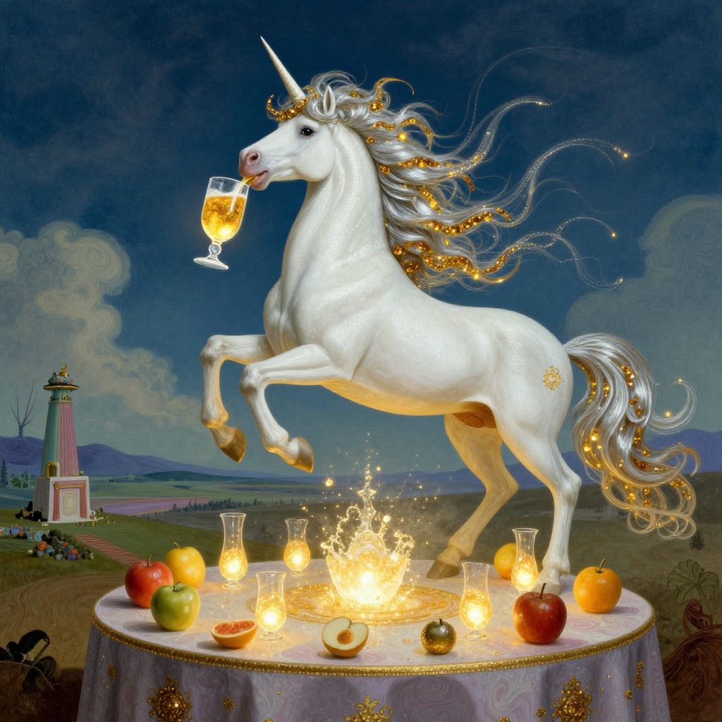 Visualize an enchanting surrealist tableau reminiscent of Salvador Dali's dreamscapes, where a mythical unicorn elegantly drinks from a glass brimming with radiant golden nectar atop a surreal table adorned with luminescent, hovering fruits. The ethereal beast's flowing mane and tail are woven from strands of glistening silver and amber light, gracefully dancing as if caressed by an unseen zephyr. From an awe-inspiring vantage point, behold this captivating confluence of fantasy, legend, and enchantment, as the unicorn's presence weaves a beguiling charm over the mesmerizing, ever-evolving landscape, invoking feelings of amazement, intrigue, and pure joy.