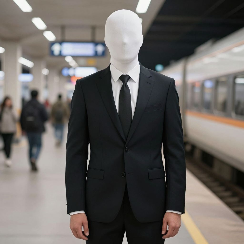 Photograph of a faceless, white-skinned man in a black suit and tie standing on a modern, brightly lit train platform.