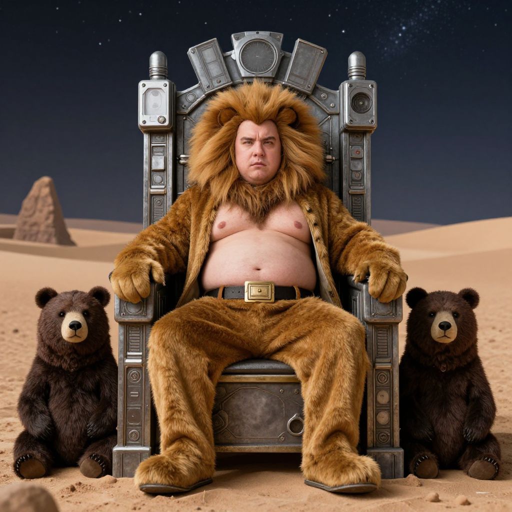 An obese man dressed in a lion costume and fur suit sits on a throne adorned with tech and surrounded by two bear figures, set against a desert backdrop with a starry sky.