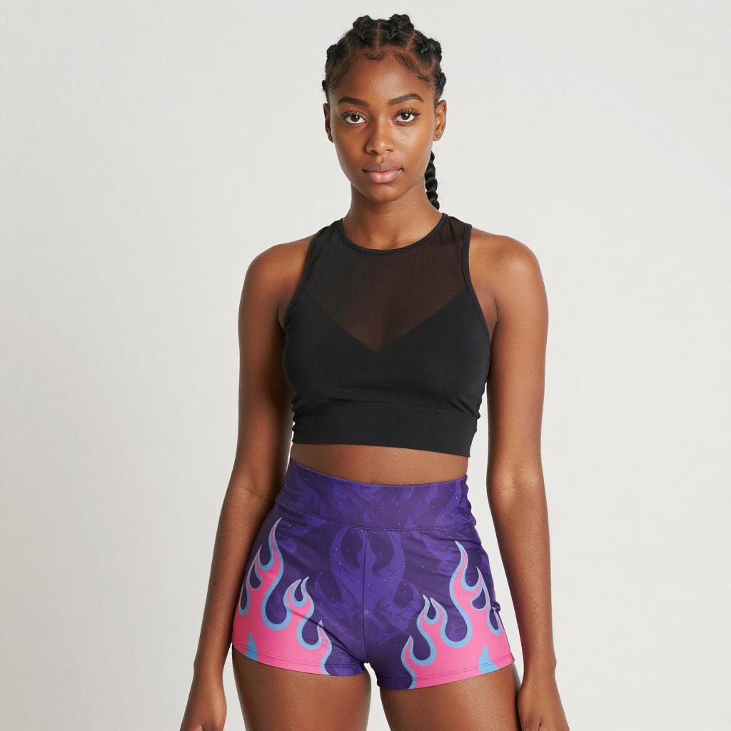 Photograph of a young Black woman with a braided ponytail, wearing a sheer black crop top and matching high-waisted shorts with vibrant purple, pink, and blue flame-like patterns. She stands against a white background, looking directly at the camera with a neutral expression.