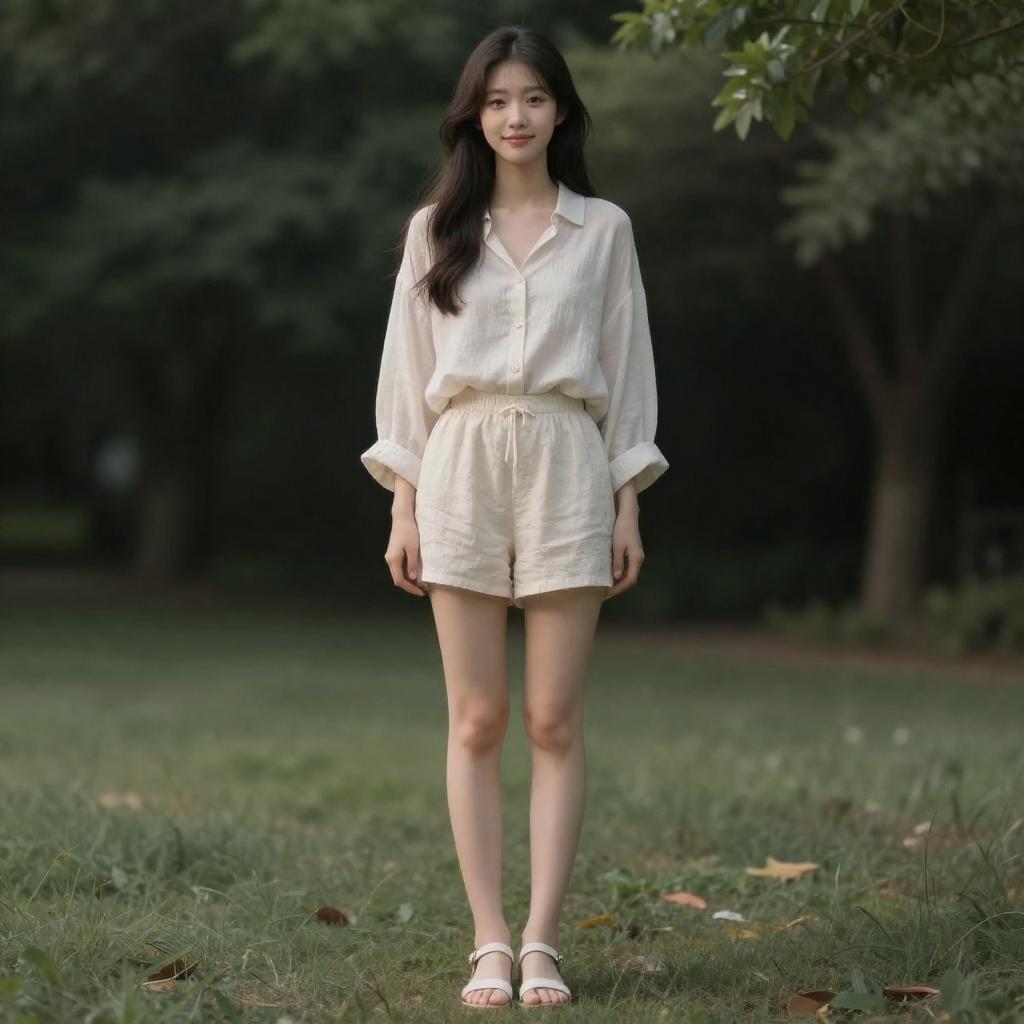 (realistic:1.4), 8k, RAW photo, best quality, (masterpiece:1.2), (photorealistic:1.7), (highres:1.2), surreal 8k, (HDR:0.5), deep, perfect artwork, incomparable masterpiece, original, high definition, top quality, cinematic lighting, photon mapping, soft lighting, radiosity, physically-based rendering, (1girl:1.2)/beautiful korean girl/full body, cute girl, (solo:1.4), model pose, detailed face, nature, pure pure, ((perfect female figure)), solo focus, shiny skin, fair skin, (( ISO 25)), looking at viewer, smile, simple background, real world location, Floral dresses and sandals, Linen shirt and wide-leg pants, Oversized shirt and short pants, Sleeveless blouses and skirts