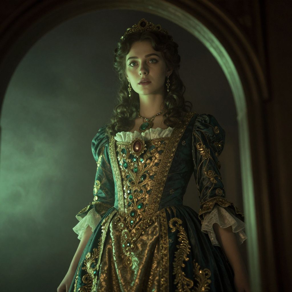Photograph of a young woman with fair skin and curly dark hair, wearing an elaborate Renaissance-style dress adorned with intricate gold and green embroidery, pearls, and gemstones. She has a regal gold crown on her head, large drop earrings, and a white lace ruffle at her sleeves. The background is dark with a greenish light haze, and she stands in a shadowed archway, giving a dramatic, medieval ambiance. Her expression is serious, and the lighting highlights the textures and details of her ornate dress. The overall mood is elegant and historical.