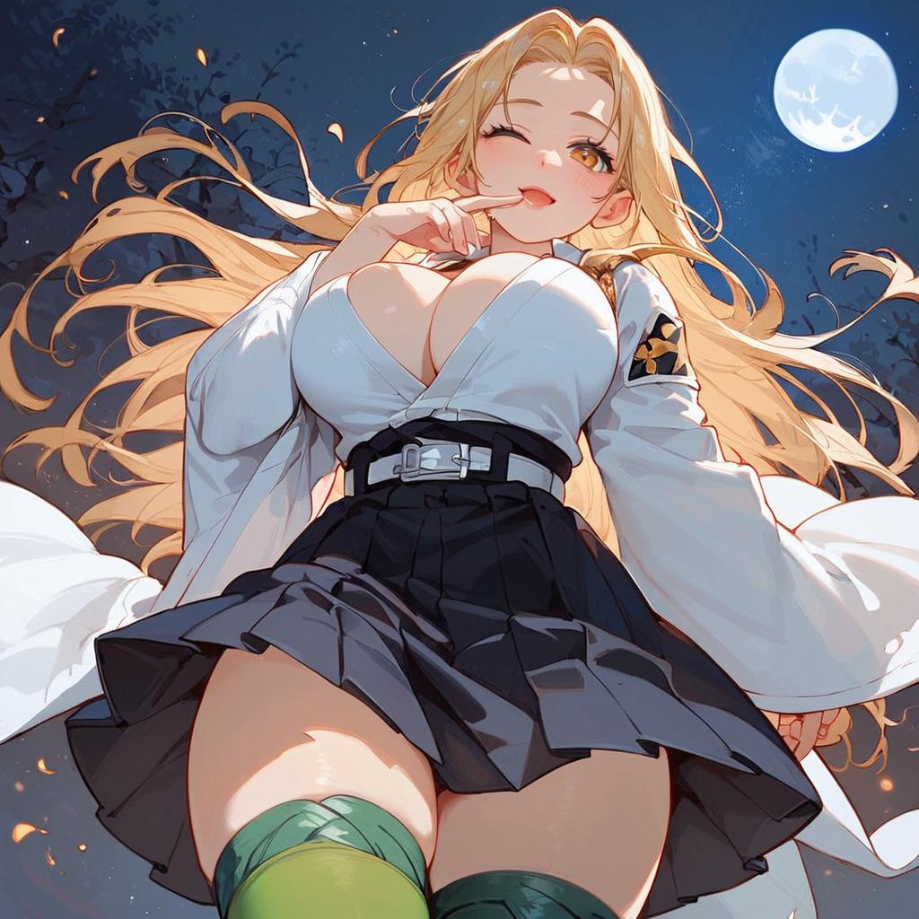 This digital anime-style illustration features a blonde woman with long, flowing hair, winking with a playful expression. She has large breasts, accentuated by a white, low-cut kimono-style top with wide sleeves and a black belt. She wears a short, black pleated skirt and green thigh-high socks. The background is a night sky with a full moon and dark, silhouetted trees. Her right hand is gently touching her lips, adding to her flirtatious demeanor. The style is vibrant, with bold colors and dynamic lighting, emphasizing her curves and the movement of her hair.