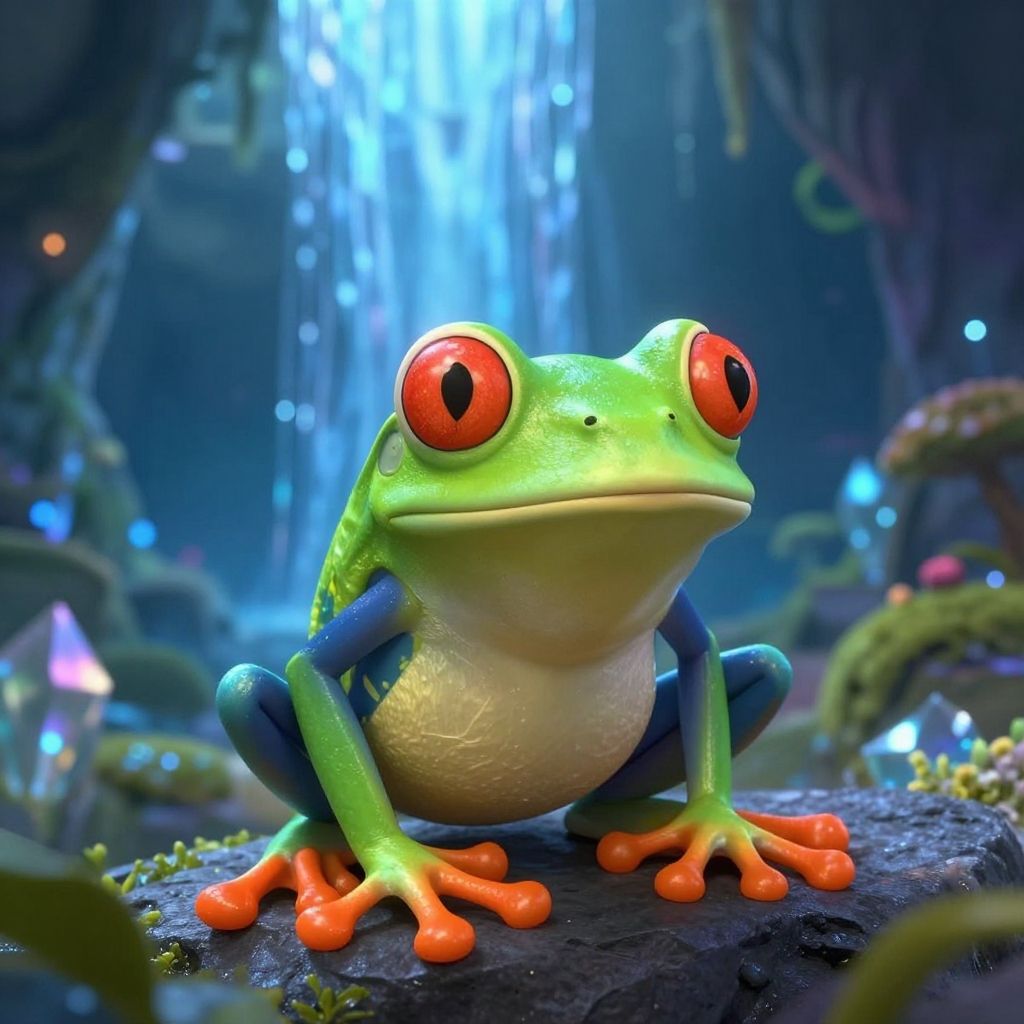 Pixar, animation, realism, (epic:1.2), realistic, trending on artstation, 3d, (high quality:1.2), (masterpiece:1.2), high details, incredibly absurdres, colorful), photograph, film, best quality, highres, (Dolly zoom), (no humans:1.2), turmeric, dark slate gray, Red-eyed tree frog, (enchanted crystal cavern with underground waterfalls)
