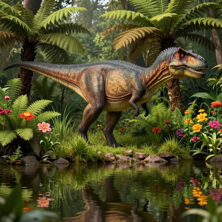 Photorealistic CGI of a vibrant, detailed, green-and-orange dinosaur standing in a lush, tropical forest by a reflective pond, surrounded by colorful flowers